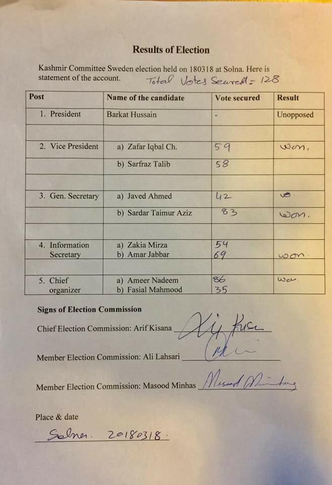 سٹاک ہوم(اردونامہ ڈاٹ ای یو) گزشتہ روز 18 مارچ اتوار کے دن کشمیر کمیٹی سویڈن (Kashmir Committee Sweden) کے انتخابات منعقد کئے گئے اور 2سال کیلئے نئی کشمیر کمیٹی کے عہدیداران کا انتخاب ووٹ کے زریعہ عمل میں لایا گیا۔ الیکشن کمیشن کی ذمہ داریاں عارف محمود کسانہ، مسعود منہاس اور محمد علی لاشاری نے انجام دیں۔